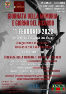 Cameri - Venerdì 11 febbraio 2022 presso la Biblioteca Civica di Cameri (via Novara 20) si terrà una serata dedicata alla Giornata della Memoria e al Giorno del Ricordo, organizzata dall’Assessorato alla cultura e dalla Commissione Biblioteca in collaborazione con ISRN Istituto Storico della Resistenza di Novara “Piero Fornara” e ANPI Cameri. Alle ore 20:45 in Sala Mostre si inaugurerà la mostra fotografica Olocausto sul Lago Maggiore realizzata da ISRN (visitabile fino al 25 febbraio, negli orari di apertura al pubblico della biblioteca); a seguire, in Sala Lettura, Federica Mingozzi condurrà la serata dal titolo Giornata della Memoria e Giorno del Ricordo, con l’intervento di Elena Mastretta, direttrice scientifica e responsabile della sezione didattica dell’ISRN, e Anna Cardano, docente e membro del comitato scientifico ISRN con interventi musicali della violinista Manuela Brignola. Federica Mingozzi presenterà anche alcuni i libri, recenti e d’archivio, dedicati al tema della serata.