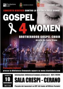 Cerano - Sabato 10 novembre alle ore 21 torna il Brotherhood Gospel Choir diretto da Paolo Viana con GOSPEL 4 WOMEN, concerto benefico contro la violenza sulle donne. Al consolidato repertorio si affiancheranno brani inediti, sempre frutto di un’attenta selezione tra i migliori brani di Gospel Contemporaneo, spaziando attraverso diversi generi musicali quali Jazz, Blues, R&B, Hip Hop, Rock, Latin e Funky. Il ricavato sarà devoluto a progetti di contrasto alla violenza sulle donne realizzati dalla Provincia di Novara.