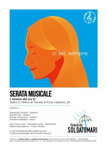 Trecate - Sabato 7 Ottobre alle ore 21 andrà in scena l’evento musicale di beneficienza Ci sei, sempre, organizzato dal Comitato SoldatoMari. L'intero incasso sarà devoluto in beneficienza al Centro Pediatrico di Port Sudan. Ingresso ad offerta libera; gradita la prenotazione. Sul palco, per una serata di musica e riflessioni da non perdere, ci saranno: Alessandro Silvestri - batteria, Bob De Fera - tastiere - Dionigi Turcinovich - chitarra e Domenico Baraban - basso; le voci: Anna Liotti, Antonella Custer, Maria Raciti, Stefania Buongiorno e Franco Rivolta. L'organizzazione e la presentazione sono a cura di Elena DeAmbrogio ed Emanuele Navazza.