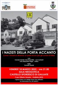 Galliate – Serata di musica e teatro per raccontare ‘I nazisti della porta accanto’. Venerdì 18 marzo alle ore 21 la Sala Neogotica del Castello Sforzesco di Galliate ospita una piece molto particolare, di carattere storico e di grande attualità dove si spiega in quale modo gli Stati Uniti divennero un porto sicuro per gli uomini di Hitler subito dopo la fine della Seconda Guerra Mondiale. Sul palco troveremo Corrado Gambi e Sara Rosamilla – voci recitanti e Livia Alexandra Hagli – violino; mentre la regia è di Corrado Gambi. L’ingresso è libero con obbligo di Green Pass rafforzato. Per ulteriori informazioni telefonare al 339 6532673. Un appuntamento non perdere, organizzato dall’Associazione Amici della Musica di Galliate in collaborazione con la Provincia di Novara e il Comune di Galliate.