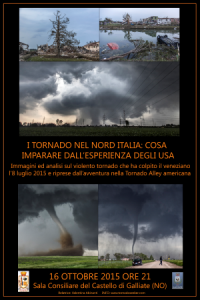 Galliate - Una serata dedicata al fenomeno tornado nel nord Italia. Cosa sono i tornado, come si formano, se e in che misura è possibile monitorarne la eventuale genesi, come auto-proteggersi? Si parlerà anche ampiamente del violento tornado che l'8 luglio 2015 ha colpito il veneziano, causando 1 morto e decine di feriti, con l’ausilio di immagini riprese sul posto durante l’evento. Durante la serata verranno anche proiettati video e numerose foto dei tornado documentati nelle Grandi Pianure americane la scorsa primavera. La partecipazione è assolutamente gratuita. Relatrice della serata sarà Valentina Abinanti che ormai da 10 anni consecutivi si reca negli Stati Uniti per documentare tornado. Appuntamento per venerdì 16 ottobre alle ore 21 nella sala consiliare del Castello Sforzesco di Galliate. La serata ha il patrocinio del Comune e la collaborazione della Pro Loco Galliate. Per ulteriori informazioni: www.tornadoseeker.com - info@tornadoseeker.com