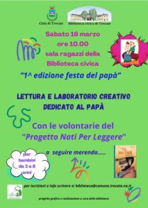 Trecate - Nuovo e importante appuntamento rivolto ai più piccoli organizzato dalla Biblioteca civica, "un appuntamento – rimarcano il sindaco Federico Binatti e l’assessore alla Biblioteca Fortunata Patrizia Dattrino – che li vedrà impegnati in un omaggio ai loro primo supereroe: il papà. Alle 10 del prossimo 16 marzo, infatti, nella Sala ragazzi, si terrà la prima edizione della “Festa del papà”, un laboratorio di lettura e creatività per i bambini dai 3 agli 8 anni animato dalle volontarie del progetto “Nati per leggere” che, come sempre, coinvolgeranno i piccoli partecipanti nelle attività a tema. Al termine sarà offerta una merenda. E’ la prima volta che la Biblioteca civica organizza un’iniziativa di questo genere: ci è sembrato bello offrire un momento di divertimento e di crescita legandolo ai papà, figura di riferimento della vita di tutti noi, in attesa della ricorrenza del 19 marzo a loro dedicata".