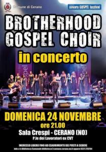 Cerano - Torna anche quest'anno a Cerano il Brotherhood Gospel Choir. L'appuntamento, che ormai da tre anni apre le festività natalizie, si terrà domenica 24 novembre alle ore 21 In Sala Crespi. "Anche quest'anno - spiega l'assessore alla Cultura, Ilaria Cornalba - il concerto chiude un percorso iniziato qualche mese fa con il Novara Gospel Festival, che organizza nella nostra Sala polivalente l'annuale workshop dedicato ai cori gospel italiani. Per il nostro Comune è sempre una gioia e un grande onore poter contribuire a questa importante manifestazione, che ricordo ha ottenuto l'anno scorso il riconoscimento di Miglior Gospel Festival Italiano. E' molto bello vedere con quanto affetto i ceranesi accolgano questa manifestazione, accrescendo ogni anno il proprio entusiasmo per il bellissimo spettacolo offerto da Paolo Viana e Sonia Turcato, La passione e il cuore con cui guidano l'imponente macchina del Festival sono davvero contagiosi, per cui non possiamo che essere loro grati per aver scelto la nostra Sala e per portare tante emozioni sul nostro palco". Non essendoci posti assegnati, si invitano i cittadini a prendere posto con un congruo anticipo.