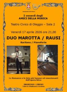 Oleggio - Venerdì 17 aprile nella Sala 2 del Teatro Civico, con inizio alle ore 21 prosegue la stagione dei concerti degli Amici della Musica di Oleggio ormai giunti al sessantesimo anno dalla fondazione, con una serata, tutta dedicata alle più famose Romanze e Arie dell’opera lirica. Saranno in pedana due musicisti, Massimo Marotta baritono (Conservatorio di Milano e Accademia di Imola) e Davide Rausi pianoforte (Conservatorio di Novara con il massimo dei voti e lode) che si sono ritagliati un ruolo importante nel panorama musicale, non solo in Italiano.