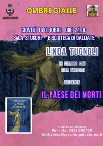 Galliate - La rassegna letteraria “Ombre Gialle” prosegue il suo viaggio nel mondo del noir e del giallo contemporaneo con un appuntamento da non perdere: giovedì 16 ottobre alle ore 21.00, presso la Biblioteca di Galliate, sarà presentato l’ultimo romanzo di Linda Tugnoli, Il paese dei morti. Il libro è pubblicato da Casa Editrice Nord ed è uscito lo scorso 26 settembre. Durante la serata, Linda Tugnoli dialogherà con Rita Garzetti, offrendo al pubblico l’occasione di approfondire i temi del libro e i retroscena della sua scrittura, approfondendo la conoscenza del suo investigatore “fuori dagli schemi”.