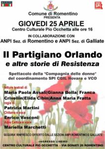 Romentino - Appuntamento voluto e organizzato dal Comune di Romentino, in particolare dal sindaco Alessio Biondo che spiega: "Abbiamo il piacere di ospitare lo spettacolo 'Il Partigiano Orlando e altre storie di resistenza', spettacolo della 'Compagnia delle donne' del coordinamento SPI CGIL Novara e VCO, organizzato insieme alle sezioni ANPI di Romentino e Galliate, vi aspettiamo alle 16 al centro Pio Occhetta".