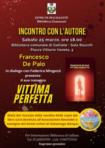 Galliate - Sabato 25 marzo, in biblioteca alle ore 18, avrà luogo il secondo incontro del 2023 della rassegna Incontri con l’Autore. Ospite della serata Francesco De Palo che, in dialogo con Federica Mingozzi, presenterà il romanzo giallo Vittima perfetta, edito nel 2022 dall’editore Porto Seguro. Vito Tarantino, protagonista del libro, uomo di successo amato dalla moglie e adorato dai figli, è un ammirato maratoneta ma, soprattutto, un bravo commissario di Polizia. Il Commissario è chiamato a indagare sulla scomparsa di Alfonso Loreto, un marito violento, che sparisce proprio quando il suo lungo percorso di recupero in carcere sembra essere giunto al termine.