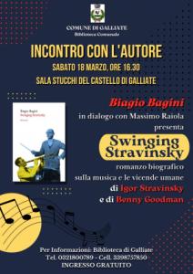 Galliate - Sabato 18 marzo, alle ore 16.30, la Biblioteca di Galliate inaugura la stagione 2023 di “Incontri con l’Autore” parlando di musica. Ospite della serata Biagio Bagini che, in dialogo con Massimo Raiola, presenterà il romanzo “Swinging Stravinsky”. Edito nel 2022 dalla casa editrice Oligo, “Swinging Stravinsky” traccia, tra realtà storica e finzione narrativa, le vicende di due artisti che hanno cambiato la storia della musica, il compositore russo Igor Stravinsky e il clarinettista americano Benny Goodman; il romanzo ci guida in un viaggio tra San Pietroburgo, Chicago e New York e, sullo sfondo, la nascita del jazz americano. Mentre scorre la grande storia del Novecento, seguiremo i due musicisti che alla fine si incontreranno in una storica sessione di registrazione discografica: la celebre registrazione di Ebony Concerto. L’evento si svolgerà presso la Sala Stucchi della Biblioteca di Galliate. Ingresso gratuito.