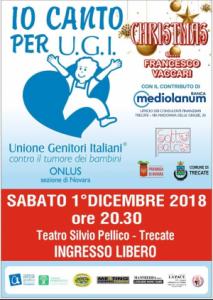 Trecate - Sabato 1° dicembre alle 20.30 al teatro Silvio Pellico l’Unione Genitori Italiani contro il tumore dei bambini onlus, sezione di Novara, propone “Io canto per U.G.I. – Christmas e… Francesco Vaccari”, una serata di canti, allegria e solidarietà patrocinata dal Comune di Trecate e dalla Provincia di Novara. Tanti cantanti si cimenteranno, professionisti e amatoriali, grandi e piccini in ricordo di un chitarrista speciale, Francesco Vaccari, scomparso prematuramente nel 2017.