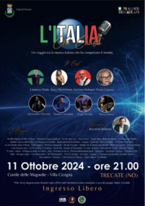 Trecate - Nuova e ultima serata della rassegna culturale “Accordi d’autore”, iniziativa gratuita organizzata dal Settore Cultura della Città di Trecate con la collaborazione della Pro Loco. Alle 21 del prossimo 11 ottobre sarà la volta de “L’Italia che canta – Un viaggio tra la musica italiana che ha conquistato il mondo”. "Sul palco allestito nel cortile delle magnolie di villa Cicogna – spiegano il sindaco Federico Binatti e il consigliere incaricato alla Cultura Mauro Bricco – saliranno diversi artisti che proporranno un ricchissimo repertorio di brani tra i più belli e famosi della musica leggera di casa nostra. Uno spettacolo a ingresso gratuito che, siamo certi, risponderà alle preferenze di diverse fasce d’età".