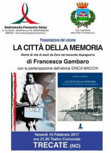 Trecate - Il Comune di Trecate ha concesso il patrocinio alla presentazione del libro di Francesca Gambaro "La città della memoria. Storie di vite di esuli da Zara nel secondo dopoguerra", che si svolgerà il prossimo 10 Febbraio alle ore 21.00 in Teatro Comunale, con letture dell’attrice Erica Macchi. L'iniziativa è organizzata in occasione del "Giorno del Ricordo", solennità civile istituita con la legge 30 Marzo 2004 n. 92, per conservare e rinnovare «la memoria della tragedia degli italiani e di tutte le vittime delle foibe, dell'esodo dalle loro terre degli istriani, fiumani e dalmati nel secondo dopoguerra e della più complessa vicenda del confine orientale». Alla fine del secondo conflitto mondiale, infatti, circa 15.000 persone, principalmente italiani, persero la vita nei campi di prigionia jugoslavi o, in modo più spiccio e più barbaro, furono gettati ancora vivi nelle “foibe”, le caverne carsiche dell’Istria, mentre 250.000 italiani dell’Istria e della Dalmazia erano costretti a lasciare le proprie case e i propri averi per sfuggire alle persecuzioni dei partigiani del feroce dittatore jugoslavo Tito.