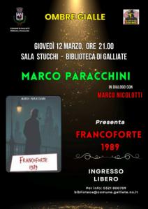 Galliate - Prosegue il viaggio nel genere poliziesco della rassegna letteraria "Ombre Gialle". Il prossimo appuntamento, previsto per giovedì 12 marzo alle ore 21, vedrà protagonista lo scrittore e regista Marco Paracchini, che presenterà il suo ultimo romanzo: "Francoforte 1989" (Fox&Sparrows Edizioni, 2025).