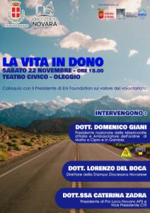 Oleggio - Il 22 novembre a Oleggio presso il Teatro civico, importante polo culturale della città, alle ore 18 si terrà l’evento “La Vita in Dono” organizzata dal Comune di Oleggio in collaborazione con Pro Loco Novara APS. Ospite d’onore il Dott. Domenico Giani – Presidente di Eni Foundation - già Direttore dei Servizi di Sicurezza e Protezione Civile e Comandante del Corpo della Gendarmeria dello Stato della Città del Vaticano, Presidente della Confederazione Nazionale delle Misericordie d'Italia e Ambasciatore del Sovrano Ordine Ospedaliero Militare di Malta (SMOM) a Cipro e in Gambia. Il secondo ospite che interloquirà col Dott. Giani sarà il Dott. Lorenzo Del Boca - Direttore della Stampa Diocesana Novarese, Presidente della Federazione Italiana Giornalismo Editoria Comunicazione (FIGEC), collaboratore di Panorama e Direttore della Stampa Diocesana Novarese. Conduce la Dott.ssa Caterina Zadra – Presidente di Pro Loco Novara APS e Vice Presidente CITI – Conseil International pour la Transmission Intellectuelle – organizzazione con sede a Parigi nata nel 1920 e prima organizzazione internazionale ad essere accreditata all’interno del Consiglio d’Europa. Il gruppo organizzativo è composto da Comune di Oleggio, Pro Loco Novara APS e Dott.ssa Laura Cognolato.