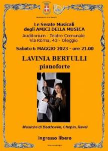 Oleggio - Prosegue la stagione dei concerti degli Amici della Musica di Oleggio con il terzo appuntamento dell’anno che avrà luogo Sabato 6 maggio presso l’Auditorium del Teatro Civico (via Roma, 43) con inizio alle ore 21. Protagonista della serata sarà la pianista Lavinia Bertulli, vincitrice di numerosi concorsi, tra i quali il Concorso internazionale “Alkan per il virtuosismo pianistico” che si tiene a Novara. Lavinia Bertulli ha un curriculum di studi davvero importante in quanto, diplomatasi a 16 anni, ha seguito i corsi della Scuola di Musica di Fiesole, poi dell’Accademia di Imola e attualmente sta completando la sua preparazione presso la prestigiosa Accademia di Santa Cecilia a Roma sotto la guida di Benedetto Lupo. Nel corso della sua attività artistica si è esibita come solista con l’orchestra del Maggio Musicale Fiorentino diretta da Fabio Luisi e ha preso parte a diversi concerti trasmessi da Radio 3. Ha trascorso un periodo di studi anche al Conservatorio Ciaikovski di Mosca e ha svolto funzioni di solista anche con l’orchestra Cherubini di Riccardo Muti. Il programma che verrà presentato è di quelli “da far tremare i polsi” come si dice, in quanto comprende la “Sonata op.26” di Beethoven con le tre famose parti: les adieux, l’absence, le retour, che descrivono l’addio degli Asburgo quando Napoleone arriva a Vienna, il loro esilio e poi il ritorno e rientrano nella categoria degli assoluti capolavori del genio di Bonn, cui farà seguito un altro capolavoro questa volta di Chopin: la “Sonata n. 2 op. 35” che contiene nel terzo movimento la “Marcia funebre” uno dei brani più suonati dai complessi bandistici. Per chiudere la serata si potrà ascoltare “La Valse” di Ravel, altro brano molto noto e di notevoli difficoltà interpretative. Si tratta dunque di un programma molto interessante che può toccare le corde dei sentimenti anche di coloro che non si ritengono “intenditori” ma che apprezzano la musica che crea atmosfere e sensazioni che poi lasciano il segno. Come di consueto ingresso libero. Nei dintorni dell’Auditorium vi sono ampi parcheggi gratuiti.