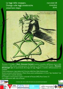 Trecate - ‘Le leggi della vergogna. Dialogo sulle leggi antiebraiche ottant'anni dopo’: se ne parla mercoledì 28 novembre alle 20.45. L’invito parte da Saverio Colacicco presidente di Anpi Trecate. Terranno il convegno il dott. Giovanni Cerutti, direttore scientifico dell'Istituto storico della resistenza e della società contemporanea nel Novarese e nel Verbano-Cusio-Ossola, e Rossana Ottolenghi, figlia di Beky Behar (cittadina onoraria trecatese) sopravvissuta alla strage del Lago Maggiore, membro dell'associazione Lev Chadash. Come moderatore, il giornalista de Il Corriere della Sera, Fabio Sottocornola. Saranno presenti anche Antonio e Mario Roma, attori professionisti e il Coro "don Gambino" che eseguirà canti e musiche ebraiche. Il convegno, che ha il patrocinio del Comune di Trecate, si terrà presso il Teatro Comunale in piazza Cavour 21.