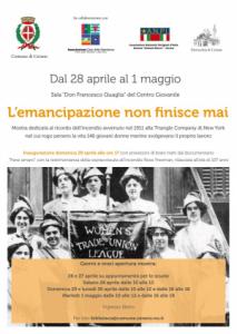 Cerano - Comune, associazione Casa delle Resistenze, Anpi - sez. Antonio Bricco di Cerano e Parrocchia presentano nella sala 'don Francesco Quaglia' del centro giovanile una mostra dedicata al ricordo dell'incendio avvenuto nel 1911 alla Triangle Company di New York, nel cui rogo persero la vita 146 giovani donne, mentre svolgevano il loro lavoro. L'iniziativa ha luogo da sabato 28 a martedì 1° maggio. L'inaugurazione ufficiale si tiene invece domenica 29 aprile alle 17, con proiezioni di brani tratti dal documentario Pane amaro, con la testimonianza della sopravvissuta all'incendio, Rose Freeman, rilasciata all'età di 107 anni.
