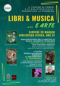 Cameri - Giovedì 29 maggio la Biblioteca civica di Cameri (via Novara 20) sarà sede di un appuntamento poliedrico, che si svolgerà sotto il cappello della rassegna “Libri&Musica” con in più una terza arte, quella della pittura: alle ore 21 infatti, in Sala Mostre, sarà inaugurata la mostra pittorica “I colori dell’anima” dell’artista camerese Maria Casarotti Scorrano, con la partecipazione del pittore, giornalista e scrittore Stefano Rabozzi. La mostra sarà visibile fino al 15 giugno negli orari di apertura della Biblioteca. A seguire, in Sala Lettura, lo scrittore Marco Nifantani presenterà il suo romanzo “Il geografo” (Les Flâneurs Edizioni) accompagnato da Federica Mingozzi e con performance musicale (piano e voce) di Omar Muratore.