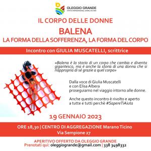Marano Ticino - Appuntamento promosso da Oleggio Grande: "Il 19 gennaio alle 18.30 presso il Centro di Aggregazione di Marano Ticino in via Sempione 27 sarà nostra ospite Giulia Muscatelli, che dialogherà con Elisa Albera a proposito del suo libro "Balena", edito da Nottetempo. Balena è il primo libro di Muscatelli, che nel 2018 aveva curato la raccolta di racconti "Brave con la Lingua" (*). Da sempre si occupa di progetti di comunicazione per aziende, e scrive. Ha un occhio attento per il linguaggio al femminile, e per le dinamiche che chiudono le donne in ruoli e figure immobili, alle quali la vivacità intellettuale di Muscatelli non si adatta e non si ferma. Coglie ogni occasione per riflettere su questi temi, utilizzando i propri canali social e le molte opportunità di incontri pubblici che Torino, dove vive, offre. Ha scritto Balena a partire da una esperienza personale dolorosa, che l'ha portata a cercare nel cibo un rifugio e un conforto; racconta infatti la sua vita da "grassa", alla ricerca di un equilibrio consapevole con un corpo di cui si vergogna e che non la rappresenta. È un libro coraggioso, che alterna passato e presente, riflessioni e racconto, per portarci a esplorare il Corpo delle Donne; siamo ben felici che abbia accettato di venire a chiacchierare con noi, perchè è proprio al corpo delle donne che Oleggio Grande ha dedicato una serie di articoli di divulgazione e approfondimento, e l'incontro di Novembre con Carolina Capria che ha visto la presenza di oltre 50 persone".