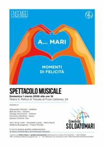 Trecate - Un pomeriggio all’insegna della musica e del cuore: domenica 1 marzo 2026, alle ore 16, il Teatro S. Pellico di Trecate (Piazza Cattaneo, 24) ospiterà lo spettacolo musicale 'A... Mari - Momenti di Felicità'. L'evento, organizzato dal Comitato SOLDATOMARI, vedrà protagonisti in una performance che promette di emozionare il pubblico attraverso un repertorio vario e coinvolgente i musicisti: Alessandro Silvestri (batteria), Bob de Fara (tastiera), Dionigi Turcinovich (chitarra), Domenico Baraban (basso) e Ignazio Cutrona (sax). Ad arricchire la parte musicale saranno le voci di Anna Liotti, Antonella Custer, Maria Raciti, Stefania Buongiorno e Franco Rivolta.