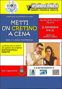 Trecate - L’Associazione ONLUS Felici di Aiutare – Happy to Help è lieta di presentare Spazioscenico nella sua commedia brillante “Metti un cretino a cena”. Lo spettacolo si terrà il prossimo 11 Novembre alle ore 21.00 presso il Teatro Silvio Pellico a Trecate. Spazioscenico è un’Associazione Trecatese, i cui principali scopi sono la promozione e la realizzazione di attività artistiche e culturali al fine di raccolte fondi per progetti a carattere sociale e benefico. Dalla sua costituzione ad oggi l'Associazione ha messo in scena più di 20 diversi spettacoli tra musical, narrazione, prosa e varietà, aiutando innumerevoli altre associazioni di volontariato a realizzare progetti di aiuto. Nella serata del prossimo 11 Novembre saranno i protagonisti di una commedia in cui…”Cosa succede se ad una dinamica donna in carriera viene proposta dalla sua assistente una cena un po'... bizzarra? E se per colpa di questa dovrà fare i conti con un creatore di opere tutt'altro che comuni, un'amica a cui ha rubato il marito, un maniaco spiritualista e un'ispettrice fiscale a cui non sfugge nulla? Se si aggiunge che la poveretta ha preso il colpo della strega e che il suo matrimonio è sul filo del rasoio... il prodotto esplosivo è garantito”.