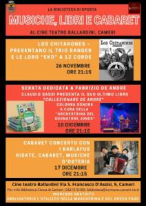 Il 17 dicembre la rassegna si chiuderà con una serata di cabaret con il concerto de “I Barlafus”, trio musicale novarese che ha come obiettivo quello di far rivivere la tradizione cabarettistica e musicale lombarda come quella dei Gufi, di Cochi e Renato e di Giorgio Gaber e altri ancora. Per l’occasione “I Barlafus” presenteranno il loro ultimo lavoro discografico nel quale anche il comune di Cameri ha in qualche modo messo “lo zampino”. A chiusura gli auguri di buon Natale saranno d’obbligo.