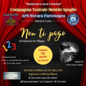 Trecate - Serata benefica con la commedia brillante “Non ti pago” di Eduardo De Filippo e messa in scena dalla compagnia teatrale “Mentite Spoglie”. L'appuntamento è al Teatro Comunale 'Bettini' in piazza Cavour (sotto i portici del Municipio) sabato 22 aprile con inizio le ore 20.30. "Si tratta di un evento organizzato da APS Club Napoli Novara Partenopea. Ingresso gratuito con offerta; il ricavato - spiega il presidente Ciro Giorgio - verrà interamente devoluto a favore della cooperativa sociale 'La Cometa' di Trecate".