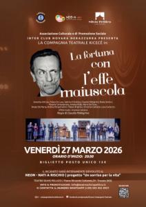 Venerdì 27 marzo alle ore 21 andrà in scena lo spettacolo La fortuna con l’effe maiuscola portato in scena dalla compagnia teatrale Kicecè. “La Fortuna Con L’EFFE Maiuscola” è un’opera esilarante, un vero e proprio classico del teatro, che si rifà alla commedia dell’arte e alla farsa con il semplice intento di divertire ed emozionare il pubblico. E’ un testo scritto nel 1942 dal grande Eduardo De Filippo, in collaborazione con Armando Curcio, uno dei principali autori e commediografi contemporanei, fondatore dell’omonima casa editrice. È una comicità che riesce a emergere dal dolore e dalle lacrime, dipingendo situazioni grottesche che talvolta sembrano poco realistiche. Un contenuto che porta lo spettatore a riflettere su alcuni aspetti antropologici della vita dell’uomo, evidenziandone le condizioni di bisogno morale, materiale e di giustizia. Il tema è quello della povertà e della fatica di tirare avanti ogni giorno: problemi, purtroppo, talvolta ancora attuali sebbene Eduardo abbia scritto questa commedia quasi 70 anni fa. Il protagonista, Giovanni, vive insieme alla sua sconfortata moglie Cristina – una donna provata dalla vita e ormai rassegnata – ed Enricuccio, con il quale c’è un completo disaccordo. Enricuccio è un caso patologico che Giovanni e Cristina hanno adottato per non lasciarlo abbandonato, in sintesi è un uomo rimasto bambino. Il protagonista, insieme alla sua famiglia, è talmente povero che vive sempre col desiderio di fare soldi con qualsiasi espediente, come se la fortuna di fare danaro potesse risolvere ogni problema. Finisce così per mettersi nei guai e, pur di racimolare qualche soldo, firma ‘carte false’. Tuttavia, nel finale arrivano la tanto attesa “buona sorte” e i bramati soldi, anche se la vera “fortuna” (quella con la “F” maiuscola), sarà la riconquista dell’affetto della famiglia, degli amici e di tutti coloro che fanno parte della sua vita. La commedia ha i crismi di universalità ed è in lingua italiana per renderla accessibile a tutti. La commedia, infatti, così recitata è proposta serenamente al fine di riportarla su un terreno culturale di carattere ‘nazionale’. Ciò, tuttavia, senza perdere la forte comicità ed il senso e il ‘sapore’ delle tradizioni popolari più profonde della città del Vesuvio.