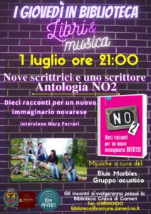 Cameri - Per i "Giovedì in biblioteca - Libri & Musica" il 1° di luglio la biblioteca ospiterà “Nove scrittrici e uno scrittore – Antologia NO2 –Dieci racconti per un nuovo immaginario novarese”. E’ la seconda parte dell’Antologia (la prima al contrario scritta da 9 scrittori e una scrittrice) sulla riscrittura della città di Novara presentata con l’aiuto di Mary Ferrari e la musica del gruppo acustico Blue Marbles.