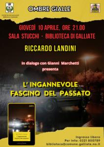 Galliate - Giovedì 10 aprile, presso la Sala stucchi della Biblioteca comunale di Galliate, alle ore 21.00, avrà luogo il quarto incontro del 2025 della rassegna Ombre Gialle. Ospite della serata Riccardo Landini che presenterà, in dialogo con Gianni Marchetti, il romanzo L’ingannevole fascino del passato, pubblicato nel 2023 da Laurana editore.
