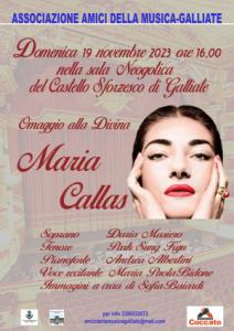 Galliate - Si tiene domenica 19 novembre a partire dalle ore 16 nel Salone neo gotico del Castello Sforzesco un concerto-evento dedicato all'artista più grande di tutte: la divina Maria Callas. L'omaggio prevede l'esibizione del soprano Daria Masiero e del tenore Park Sung Kyu, accompagnati al pianoforte da Andrea Albertini. Nel corso del pomeriggio musicale è previsto anche l'intervento della voce recitante di Maria Paola Bidone; inoltre sarà possibile vedere alcune immagini preparate per l'occasione da Sofia Baiardi. L'appuntamento è promosso e organizzato dagli Amici della Musica di Galliate, in particolare dalla presidente Rosangela Gallina. Per ulteriori informazioni cell. 339 6532673 - amicidellamusicagalliate@mail.com (non gmail!).
