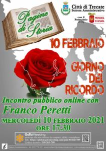 Trecate - Nell’ambito del progetto “Pagine di Storia”, patrocinato dalla Provincia di Novara, il Comune di Trecate organizza il secondo appuntamento in occasione del Giorno del Ricordo. Mercoledì 10 febbraio, alle ore 17.30, Franco Peretti, studioso e storico trecatese, parlerà dell’esodo giuliano-dalmata avvenuto alla fine della Seconda Guerra Mondiale e dell’immane tragedia delle foibe, a cui l’Amministrazione comunale ha intitolato una piazza proprio perché la memoria di quei tragici avvenimenti non venga mai meno. «Dopo quello realizzato lo scorso 27 gennaio in occasione del Giorno della Memoria, l’Amministrazione ha voluto dedicare un incontro al Giorno del Ricordo – hanno dichiarato il Sindaco Federico Binatti e il consigliere incaricato alla Cultura Patrizia Coraia – Nonostante non sia possibile realizzare questi eventi in presenza, è importante continuare a parlare di quanto successo nel nostro recente passato perché atrocità simili non possano accadere mai più».