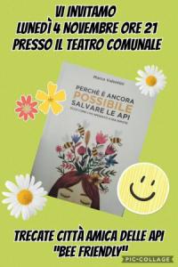 Trecate - Lunedì 4 novembre alle ore 21 in Teatro comunale, alla presenza dell’assessore all’Ambiente Roberto Minera e dei consiglieri Patrizia Coraia e Patrizia Dattrino, lo scrittore ed esperto Marco Valentini presenterà il suo libro “Perché è ancora possibile salvare le api. Ecco come l’ho spiegato a mia nipote”. «Riteniamo importante informare la cittadinanza sulle caratteristiche dell’ape, un insetto fondamentale per il nostro ecosistema – ha dichiarato l’assessore Minera – Lo scopo della serata è sensibilizzare i trecatesi su questo tema, grazie a un esperto che fornirà chiarimenti e spiegazioni».