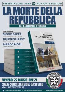 Galliate - Venerdì 22 marzo alle ore 21, presso la sala consigliare del castello di Galliate (NO), il gruppo Casa Pound Novara presenta il libro 'La morte della Repubblica' (ed.Altaforte). "Nostro ospite sarà l'autore Marco Mori, avvocato da anni impegnato nella divulgazione, su un piano strettamente scientifico, delle ragioni di incompatibilità tra trattati europei e Costituzione. Sovranità europea è il nuovo modo con cui ci chiedono di cedere sovranità. Se esiste una sovranità europea non esiste più una sovranità italiana. Sic et simpliciter".