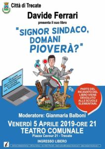 Trecate - Venerdì 5 aprile alle 21 nel Teatro Comunale ci tiene la presentazione del libro ‘Signor Sindaco, domani pioverà?’ di Davide Ferrari, primo cittadino di Galliate. Modera la serata il giornalista Gianmaria Balboni. Lo stesso autore ricorda che parte del ricavato sarà devoluto alle scuole elementari dei paesi in cui il libro verrà venduto. Ecco un breve profilo del libro: “Dieci anni da Sindaco - racconta lo stesso Ferrari – di un ridente paesino del Piemonte, sempre su Facebook, dal primo giorno di mandato, per creare un rapporto ‘speciale’ con i propri cittadini, di cui ho raccolto centinaia di messaggi, segnalazioni, richieste, le più strampalate e sgrammaticate... Galliate, il mio paese, potrebbe però essere ovunque in Italia: stessi problemi, stessi cittadini, stessi messaggi: come un Truman Show che si ripete uguale in tutta la penisola. Una decina di capitoli che descrivono le vita quotidiana di un Sindaco alle prese con i suoi ‘leoni da tastiera’: dai rifiuti ai Vigili, dai Lavori pubblici alle manutenzioni, passando per le cacche dei cani, le campane rumorose, l’erba che cresce, le feste di piazza e le elezioni comunali... Tutti quadri quotidiani dei quali cerco di offrire da un lato la prospettiva, con tagli divulgativo, di un amministratore pubblico, dall’altro la visione dei cittadini più ‘agguerriti’ con la tastiera. Ne emerge un forte contrasto tra la realtà e come i cittadini spesso la vedono, ma anche una gran voglia di comunicare con il Comune e con il suo Sindaco, al quale ogni cittadino si sente libero di chiedere qualsiasi cosa: che scuola consigliare alla figlia?, A che ora sono le Messe? oppure, appunto, Se domani pioverà?: una voglia di comunicare che accorcia le distanze tra il cittadino e la pubblica amministrazione e aumentando la fiducia nella stessa. Il fatto che molti messaggi siano zeppi di errori ortografici da terza elementare mi ha spinto a donare parte del ricavato alle scuole elementari del mio paese e di ogni paese in cui il libro verrà venduto”.