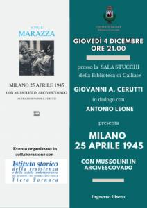 Galliate - Giovedì 4 dicembre, alle ore 21, presso la Sala Stucchi della Biblioteca di Galliate, si terrà un evento di grande rilevanza storica: la presentazione del libro di Achille Marazza Milano 25 aprile 1945 con Mussolini in Arcivescovado. L'autore, testimone diretto di quei drammatici giorni, racconta la sua esperienza durante le trattative tra il Comitato di Liberazione Nazionale e Benito Mussolini, che si svolsero nel pomeriggio del 25 aprile 1945, proprio presso l'Arcivescovado di Milano. L'incontro vedrà la partecipazione di Giovanni Cerutti, che dialogherà con Antonio Leone, Vice Presidente dell'Istituto Storico della Resistenza e della società Contemporanea Piero Fornara. Insieme rifletteranno sul significato di quei momenti decisivi che portarono alla Liberazione dell'Italia dal nazifascismo.