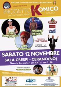 Cerano - Assolutamente da non perdere per gli appassionati di cabaret l'appuntamento del 12 novembre con Progetto Komico, in programma a partire dalle ore 21 nella Sala Crespi. Secondo evento con la stagione che prevede anche musica ed è realizzata da Asclama e dal Comune di Cerano. Direttamente da Zelig, Colorado ed Eccezionale Veramente ci saranno: Enzo Emmanuello, Massimo De Rosa, Vito Garofalo, con la Komic Band ed il Mago Rum. Presenta Vale Valerio. Ingresso: 8 euro. Vendita biglietti presso biblioteca comunale.
