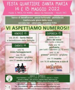 Trecate - Tutto pronto al Quartiere Santa Maria per la tradizionale festa rionale in programma il prossimo fine settimana, da venerdì 13 a domenica 15 maggio nell’omonimo piazzale (tra via Novara e via Barassino). Per la gioia di grandi e piccoli ci sarà il banco di beneficenza, la pesca fortunata, la pentolaccia, il gioco della rana (quanti ricordi!) e il servizio bar con la possibilità di gustarsi anche panini con la salamella e patatine fritte. Venerdì 13 alle 20.45 è in programma la Santa Messa con la benedizione delle famiglie. Sabato 14 i festeggiamenti iniziano alle 15 e alle 19.30 cena a base di lasagne e grigliata (è gradita la prenotazione anche per l’asporto telefonando al 353 4290548 oppure mandando un’email a santamaria.quartiere@gmail.com; alle 21 serata musicale. Domenica 14 dalle 9 fiera del dolce con torte e biscotti; dalle 10 gonfiabile per tutti i bambini (3-10 anni) e alle 12.30 pranzo con paniscia e grigliata; alle 15 incanto e alle 16.30 esibizione a cura di Movida Danza. I pasti sono in collaborazione con l’Osteria Santa Maria. Intrattenimento e giochi invece a cura del Comitato genitori ‘Rodari’.