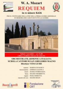 Cerano - In occasione dei 100 anni della fine della Prima Guerra Mondiale, l'Amministrazione Comunale in collaborazione con la Parrocchia, propone l’esecuzione del Requiem di Mozart, dedicandolo ai caduti di tutte le guerre. L'iniziativa è stata inserita tra gli eventi legati alla "Commemorazione del centenario della Prima Guerra Mondiale" e alla stessa è stato concesso l'uso del logo ufficiale da parte della Struttura di Missione della Presidenza del Consiglio dei Ministri. La rappresentazione si terrà sabato 3 novembre in Chiesa Parrocchiale e sarà affidata all'Orchestra Filarmonica Italiana con la Schola Cantorum San Gregorio Magno di Trecate.