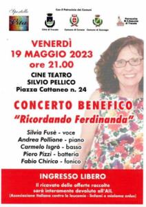 Trecate - L’associazione “Sportello Vita” ricorda organizza il benefico “Ricordando Ferdinanda”, iniziativa patrocinata dalla Città di Trecate in programma per il prossimo 19 maggio in memoria di Ferdinanda Zanaria, storica presidente del sodalizio trecatese, scomparsa lo scorso dicembre. L’appuntamento è alle 21 al cineteatro “Silvio Pellico”, dove si esibiranno Silvia Fusè (voce), Adrea Pollione (piano), Carmelo Isgrò (basso), Piero Pizzi (batteria), con il servizio fonico a cura di Fabio Chirico. L’ingresso è libero: il ricavato delle offerte raccolte sarà interamente devoluto all’Associazione italiana contro le leucemie, linfomi e mieloma onlus.