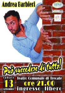 Trecate - Il 13 settembre alle ore 21.00 torna sul palco del Teatro Comunale di Trecate Andrea Barbieri, giovane e promettente artista trecatese. Dopo oltre un anno dal suo ultimo spettacolo, infatti, il 13 settembre andrà in scena “Può succedere di tutto!”, un one man show nel segno della continuità con la comicità tradizionale italiana, un flusso di storie che offre al pubblico un fiume ininterrotto di oltre cento minuti di spettacolo dal ritmo serrato, in cui Andrea trasforma, ancora una volta, la quotidianità in show, giocando con i paradossi di oggi attraverso la sua immancabile ironia. «Uno spettacolo allegro ma soprattutto onesto, dove gli sforzi per evitare i trabocchetti del già visto e del già sentito si fanno rispetto per l'intelligenza di chi osserva. Uno show di ricordi e speranze – racconta Andrea Barbieri – che affronto senza innamorarmi della cronaca spicciola, che ammuffisce dopo un giorno, e senza lasciarmi coinvolgere dalle mode del momento. Lo spettacolo vuole far ridere e affronta a 360 gradi la voglia di divertire senza tabù: non c’è tema che non potrà essere toccato. Per cavalcare il mio ruolo di comico senza costrizioni».