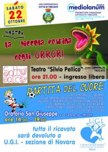 Trecate - Anche quest’anno Trecate vivrà un’intera giornata nel segno degli aiuti per i bambini della pediatria oncologica di Novara, con il patrocinio del Comune. Gli eventi del prossimo sabato 22 ottobre inizieranno già nel pomeriggio con una “Partita del Cuore” presso la struttura sportiva dell’Oratorio San Giuseppe di Trecate, nella quale si affronteranno le squadre dell’Oratorio stesso e delle Amministrazioni comunali di Trecate, Galliate e Novara. Prenderanno parte a questo momento sportivo e di divertimento anche i ragazzi disabili dei centri diurni del C.I.S.A. Ovest Ticino. La serata, invece, sarà dedicata ad un musical messo in scena dalla giovane compagnia trecatese dei Sottopalco, che interpreterà nel Teatro Silvio Pellico di Trecate “La piccola vetrina degli orrori”, rivisitazione di un celebre musical off-broadway.