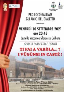 Galliate - Una serata per sorridere... rigorosamente in dialetto galliatese. "Venerdì 10 settembre - come spiega il sindaco Claudiano Di Caprio - nella splendida cornice del Castello Sforzesco, la Pro Loco e Gli Amici del Dialetto organizzano lo spettacolo 'Ti fai a Varòla...? I vugunsi in Casté', che assicurerà tante risate". L'ingresso è libero; si entra solo con la mascherina e muniti di green pass dall'ingresso in piazza Vittorio Veneto. In caso di maltempo la commedia sarà anticipata al giorno prima, giovedì 9 settembre. Per ulteriori informazioni contattare il 335 7832258 (Marco Bozzola) oppure il 349 6404341 (Giuse della Pro Loco) - info@prolocogalliate.it.