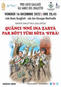 Galliate - Venerdi 16 dicembre alle ore 20.45 nella sala don Manfredda dell'Oratorio Beato Quagliotti di Galliate si svolge la consueta edizione della “Serata Dialettale”, giunta alla 23a edizione. Il tema della serata, organizzata dagli “Amici del dialetto” in collaborazione con la Pro Loco di Galliate, si nota dal titolo della locandina: “Quanti soldi hanno sprecato per mettere i tubi interrati!”. Canzoni, poesie e soprattutto scenette che si svolgeranno tra il serio, il semiserio e il comico.