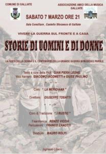 Galliate - Sabato 7 marzo alle 21 nella sala consiliare del Castello di Galliate, gli Amici della Musica di Galliate presentano una serata a doppio tema: La Festa della Donna ed il Centenario dell'inizio della Prima Guerra Mondiale. Si racconteranno, in musica e parole, il travaglio degli uomini impegnati al fronte e la difficile vita delle donne che, rimaste sole a casa, hanno dovuto occupare anche il ruolo degli uomini. Queste "Storie di Uomini e di Donne" racconteranno l'illusione che sarebbe stata una "guerra breve"... le prime battaglie sindacali femminili nelle fabbriche... storie d'amore.... Si ascolteranno canti alpini e canti popolari del periodo a cavallo tra il XIX e il XX Secolo. Il testo è stato scritto dalla professoressa Gian Piera Leone. Voci Recitanti: Giacomo Iacometti e Giuse Paglino. Cori: La Meridiana di San Pietro Mosezzo diretto da Giuseppe Tosatti e Coro “di Tradizione” I Rustic di Trecate, accompagnati alla fisarmonica da Renzo Vicchi, alle percussioni da Franco Zanotti, diretti da Mauro Rolfi. L'ingresso è libero e gratuito.