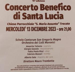 Trecate - Appuntamento alle 21 del prossimo 13 dicembre, in chiesa parrocchiale, con il tradizionale Concerto benefico di Santa Lucia, giunto alla sua diciannovesima esizione, organizzato dal Lions Club Ticino-Torre del Basto, iniziativa inserita nel calendario degli eventi natalizi a cura della Città di Trecate e delle associazioni locali. A esibirsi sarà la Schola cantorum “San Gregorio Magno” diretta dal maestro Mauro Trombetta con la partecipazione del soprano Annarita Taliento, del mezzosoprano Giorgia Gazzola, dei musicisti Fabio Paolo Rizzi e Fabrizio Mezzari e del maestro del coro Alberto Sala. I fondi raccolti saranno destinati a finanziare gli screening visivi gratuiti per la prevenzione di ambliopia e strabismo, effettuati da personale specializzato dell’Unione italiana ciechi e ipovedenti di Novara, a favore dei bambini delle Scuole dell’Infanzia trecatesi.