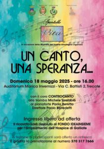 Trecate - L’associazione “Sportello Vita”, in occasione della Giornata del malato oncologico, organizza, con il patrocinio della Città di Trecate e dei Comuni di Cerano e Sozzago, per le 16 del prossimo 18 maggio, all’auditorium “Marica Invernizzi” il concerto “Un canto, una speranza…”. A esibirsi sarà il coro “Controcanto” e i musicisti Michele Tarabbia (tromba) e Paolo Beretta (pianoforte) diretti dal maestro Paolo Benedetti. Al termine è previsto un rinfresco offerto dall’Amministrazione comunale. L’ingresso è a offerta libera: il ricavato sarà devoluto a favore del fondo “IdeaInsieme” per l’ampliamento dell’hospice di Galliate. E’ gradita la prenotazione telefonando al numero 370 3177666.