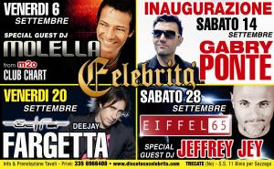 Trecate - (i.p.) Un mese di settembre da urlo al ‘Cele’: non nomi, ma grandi, anzi grandissimi nomi, nella programmazione di settembre della discoteca Celebrità. Gli ultimi sgoccioli della bella stagione si possono godere nelle serate all’insegna del fashion e del glamour nell’estivo con Molella (venerdì 6) e una grandissima sorpresa nella settimana successiva proprio per la chiusura dell'estivo... Sabato 14 arriva un altro amico del Cele, direttamente dalla giuria di Amici 2013 ecco che torna a Trecate Gabry Ponte. Venerdì 20 sarà la volta di un altro noto deejay: Fargetta. Infine sabato 28 ecco l’altro ‘pezzo’ degli Eiffel 65: Jeffrey Jey. Per ulteriori informazioni e per la prenotazione dei tavoli nel privé telefonare al 335 6966408, oppure visitate il sito web www.discotecacelebrità.com. A settembre finisce l’estate ma continua il divertimento.