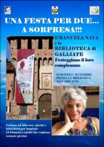 Galliate - Sorpresa in biblioteca! Da 17 anni la biblioteca svolge la sua attività in Castello, da quando nel 1998 è stata trasferita da via Matteotti. Per festeggiare l’evento martedì 1° settembre Emanuela Nava, scrittrice di letteratura per l’infanzia di fama internazionale, offre in biblioteca un incontro di lettura ad alta voce, con giochi e laboratori per bambini dai 5 ai 10 anni, con l’organizzazione della Biblioteca e la collaborazione dei volontari Amici della Biblioteca. Alle ore 17 sono invitati genitori, nonni e bambini. Al termine, aperitivo e merenda a sorpresa.