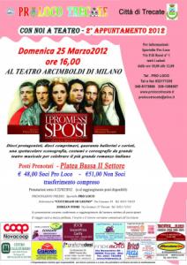 Trecate - Secondo appuntamento 2012 della serie "Con noi a teatro" quello che organizza la Pro Loco Trecate per il prossimo 25 marzo al Teatro degli Arcimboldi di Milano. In scena, alle ore 16 "I Promessi Sposi", opera moderna dal romanzo di Alessandro Manzoni, opera italiana al 100%, storia che non è una storia, ma la "storia" per eccellenza nell'ambito del romanzo italiano.
