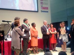 Torino - Ecco una significativa immagine fotografica della cerimonia conclusiva del concorso "Lingua Madre", svoltasi la mattina di lunedì 20 maggio al Salone del LIbro di Torino, dove il sindaco Andrea Ballarè ha consegnato il primo premio assoluto a Gul Ince, novarese di origine turca e il premio speciale dei Rotary Club a Lina Alushi, giovane novarese di origine albanese. "La cerimionia - racconta lo stesso Ballarè - tenutasi davanti ad una vera folla, ha avuto come protagonista la ministra per l'Integrazione, Cecile Kyenge, alla quale ho brevemente illustrato il progetto, che avrà la sua prima attuazione il prossimo 2 giugno, di attribuzione di un attestato simbolico di cittadinanza ai bambini nati a Novara da genitori immigrati. Il ministro ha anche accolto di buon grado il mio invito a venire a Novara in visita alla mostra Homo Sapiens, in corso di svolgimento al Broletto".